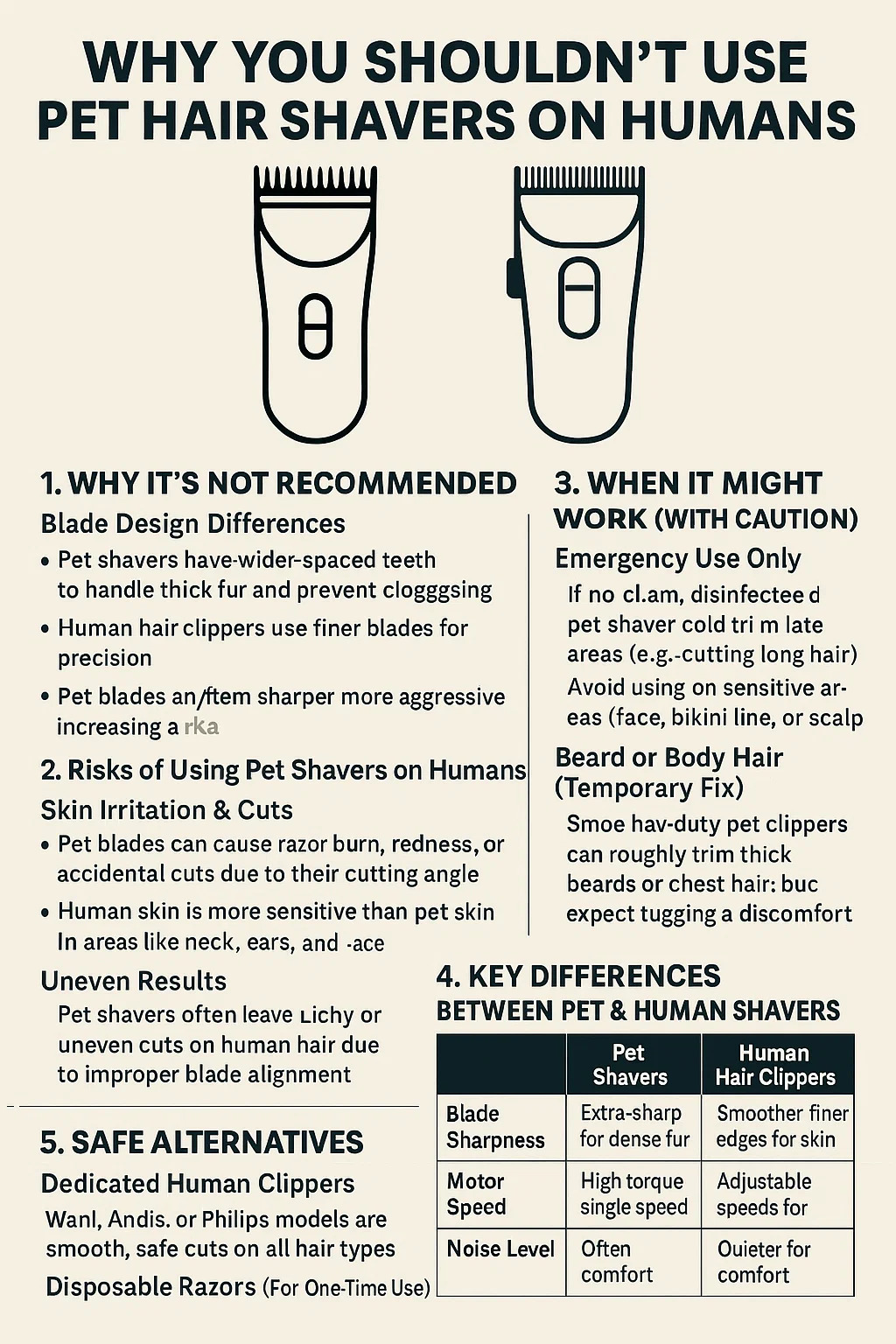 In ainneoin go Shavers Gruaige Peataí Agus d’fhéadfadh sé go mbreathnódh bearrthóirí gruaige daonna cosúil leo, níl siad inmhalartaithe mar gheall ar dhifríochtaí deartha agus sábháilteachta tábhachtacha. Seo miondealú mionsonraithe: