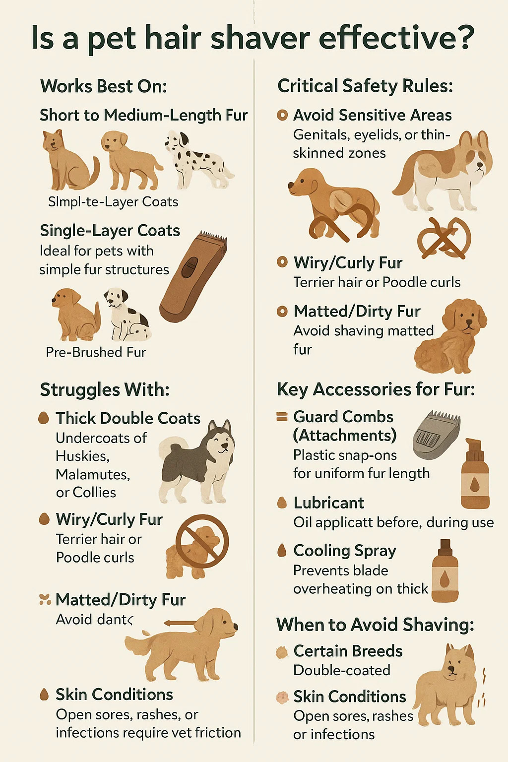 Sea, a Shaver Gruaige Peataí (ar a dtugtar bearrthóirí peataí nó ciumhsóirí freisin) tá sé deartha go sonrach chun oibriú ar fhionnadh ainmhithe, ach braitheann éifeachtúlacht ar chineál fionnaidh, ar chaighdeán uirlisí agus ar theicníc. Anseo thíos tá miondealú mionsonraithe:
