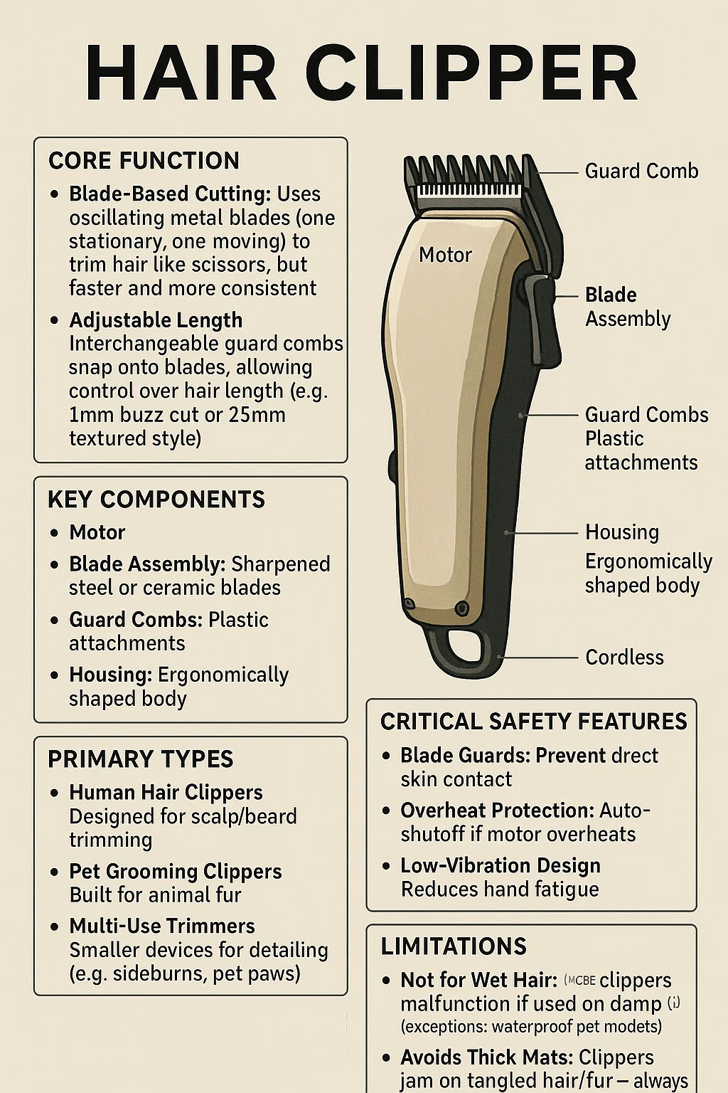 A clipper gruaige Is uirlis grúmaeireachta leictrigh é atá deartha chun an ghruaig a ghearradh go héifeachtúil agus go haonfhoirmeach. Seo miondealú mionsonraithe ar a phríomhghnéithe agus a úsáidí:
