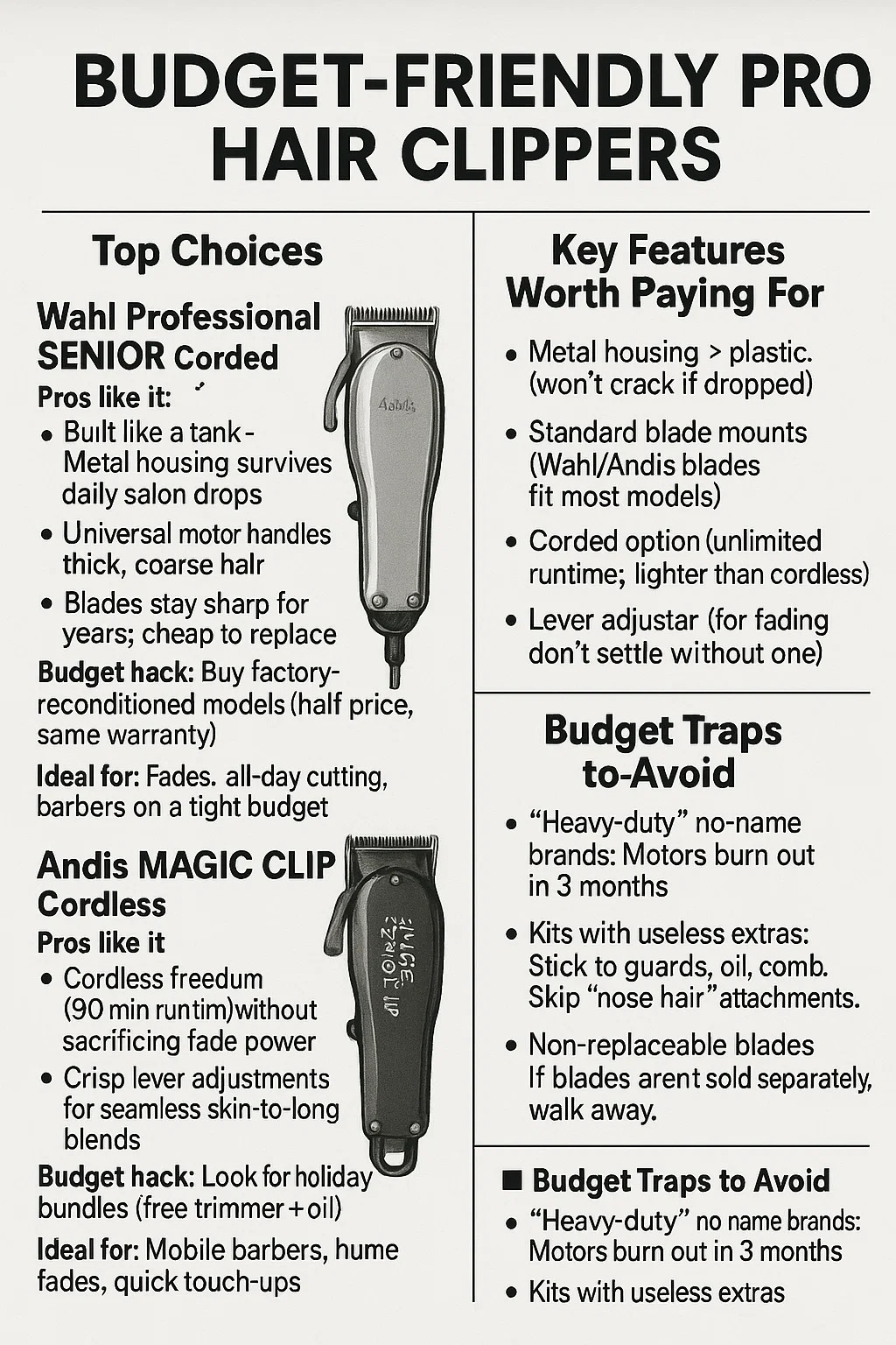 Ideal le haghaidh: Fades, gearradh ar feadh an lae, bearbóirí ar bhuiséad daingean.