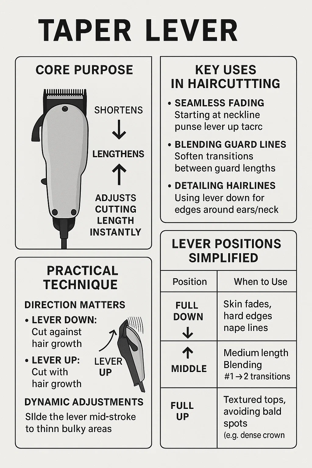 Giorraíonn an ghruaig nuair a bhrúitear síos é (↓): Bogann lanna níos gaire dá chéile, ag gearradh gruaige níos gaire don scalp. A úsáidtear le haghaidh fades daingean nó imill ghéara.